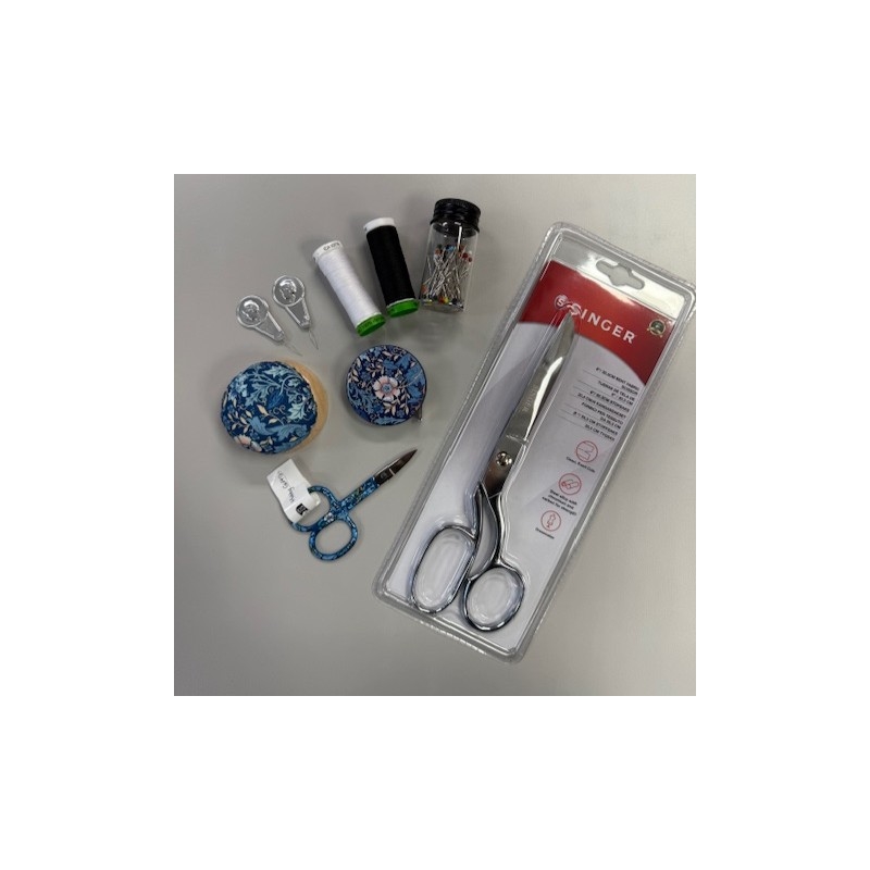 I setet ingår en tygsax för klippning av tyg, en trådsax för precision och detaljer samt ett upprullningsbart måttband som gör det enkelt att mäta vid sömnadsprojekt. Den medföljande nåldynan håller nålarna säkert på plats, medan knappnålar med huvud ger god kontroll vid nålning av tyg.
