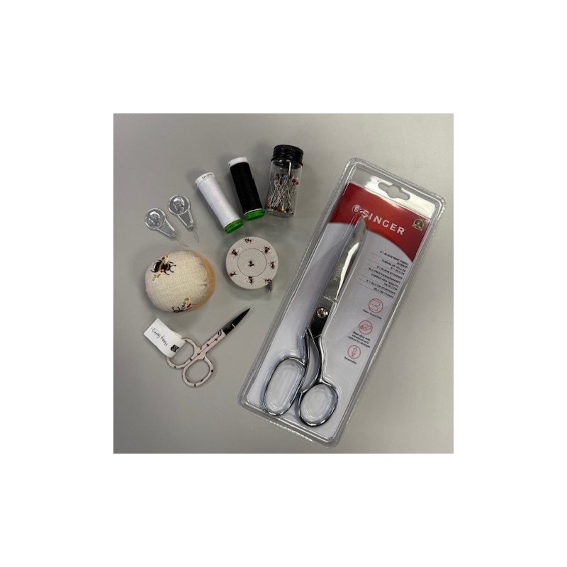 I setet ingår en tygsax för klippning av tyg, en trådsax för precision och detaljer samt ett upprullningsbart måttband som gör det enkelt att mäta vid sömnadsprojekt. Den medföljande nåldynan håller nålarna säkert på plats, medan knappnålar med huvud ger god kontroll vid nålning av tyg.