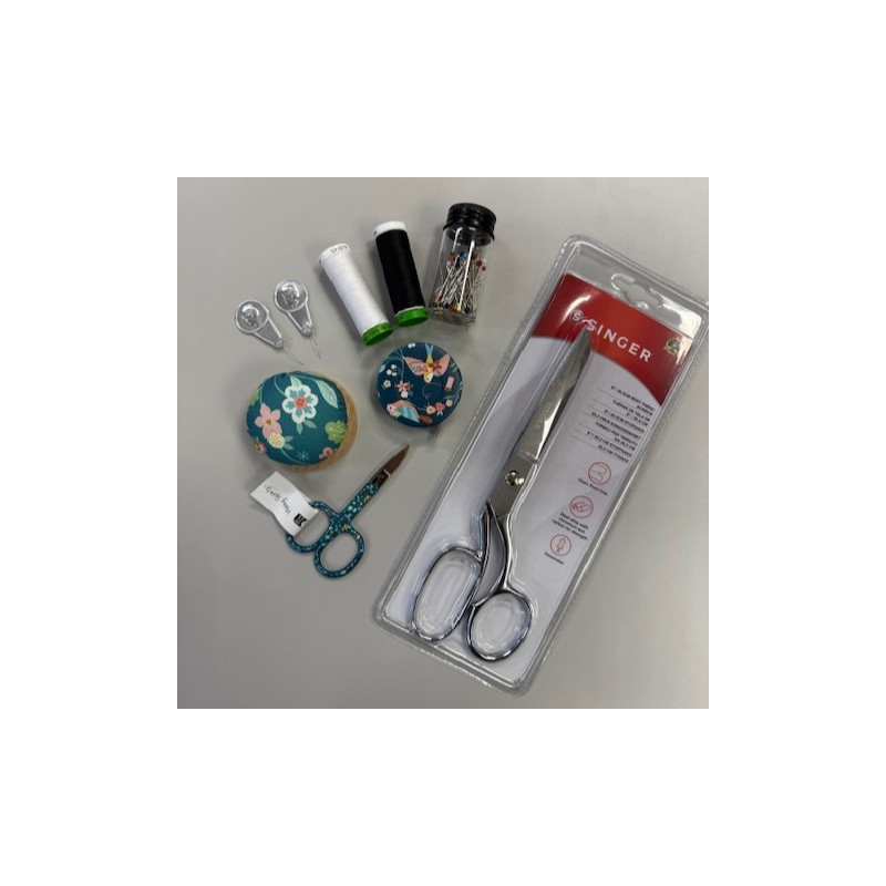I setet ingår en tygsax för klippning av tyg, en trådsax för precision och detaljer samt ett upprullningsbart måttband som gör det enkelt att mäta vid sömnadsprojekt. Den medföljande nåldynan håller nålarna säkert på plats, medan knappnålar med huvud ger god kontroll vid nålning av tyg.