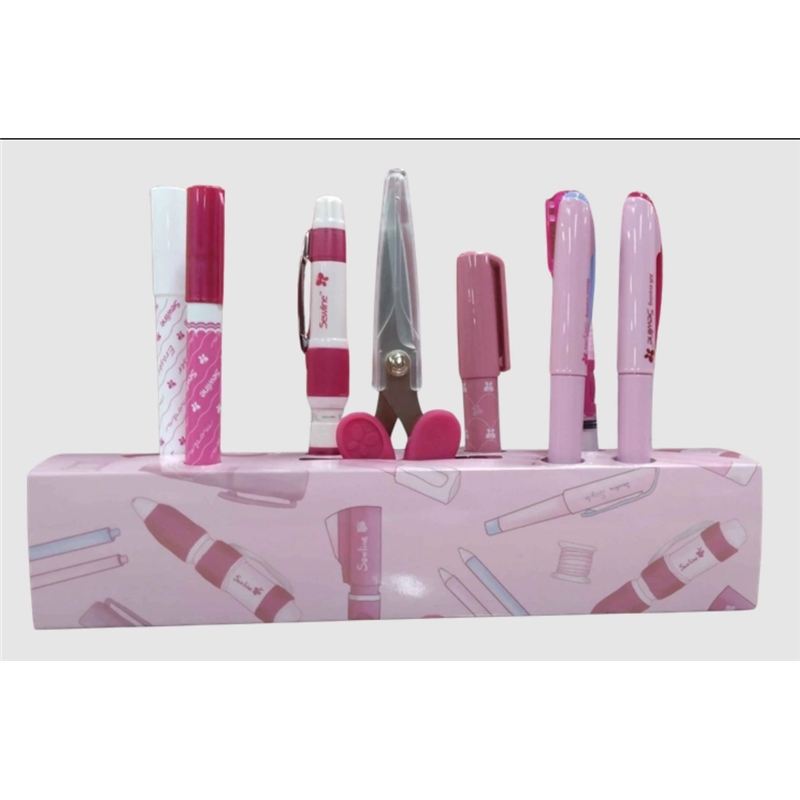 Markeringspennorna erbjuder flera olika lösningar beroende på material och behov – från kalkstift och luftförsvinnande markeringar till vattenlösliga linjer. Setet kompletteras med raderingspennor, limpenna och sax, vilket gör det till ett komplett kit för både nybörjare och erfarna sömnadsentusiaster.