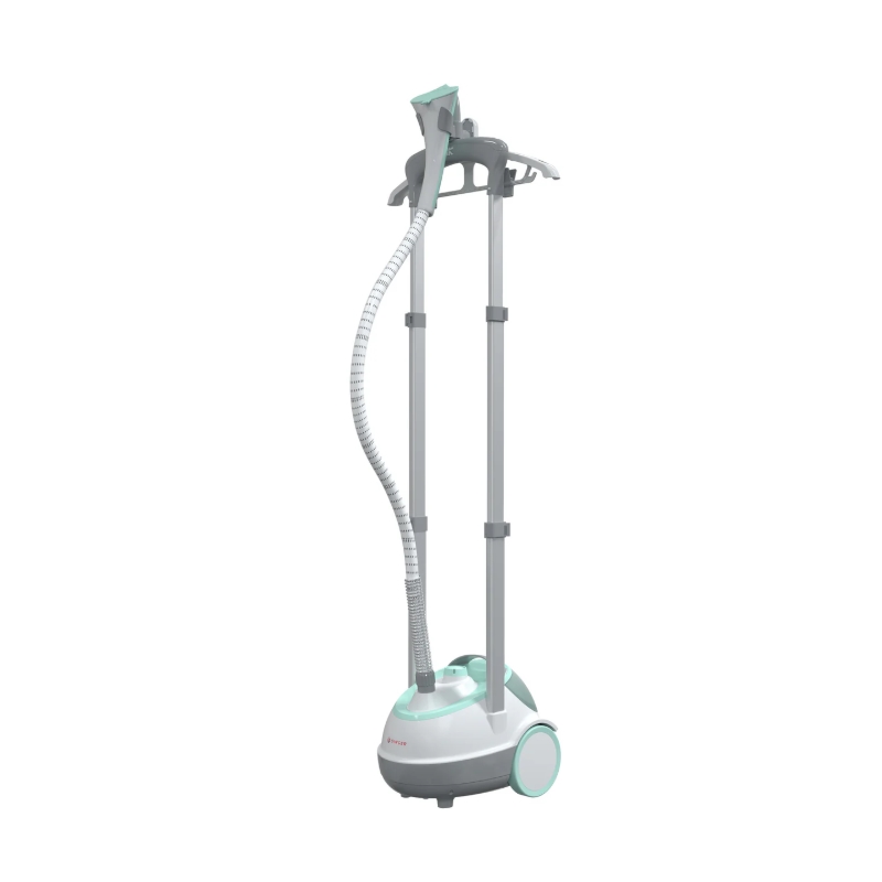 Den värms upp på bara 45 sekunder, har automatisk avstängning när tanken är tom och kommer med praktiska tillbehör som byxpress och tygborste. De justerbara teleskopstängerna ger stabilitet under användning och fälls enkelt ihop för smidig förvaring.