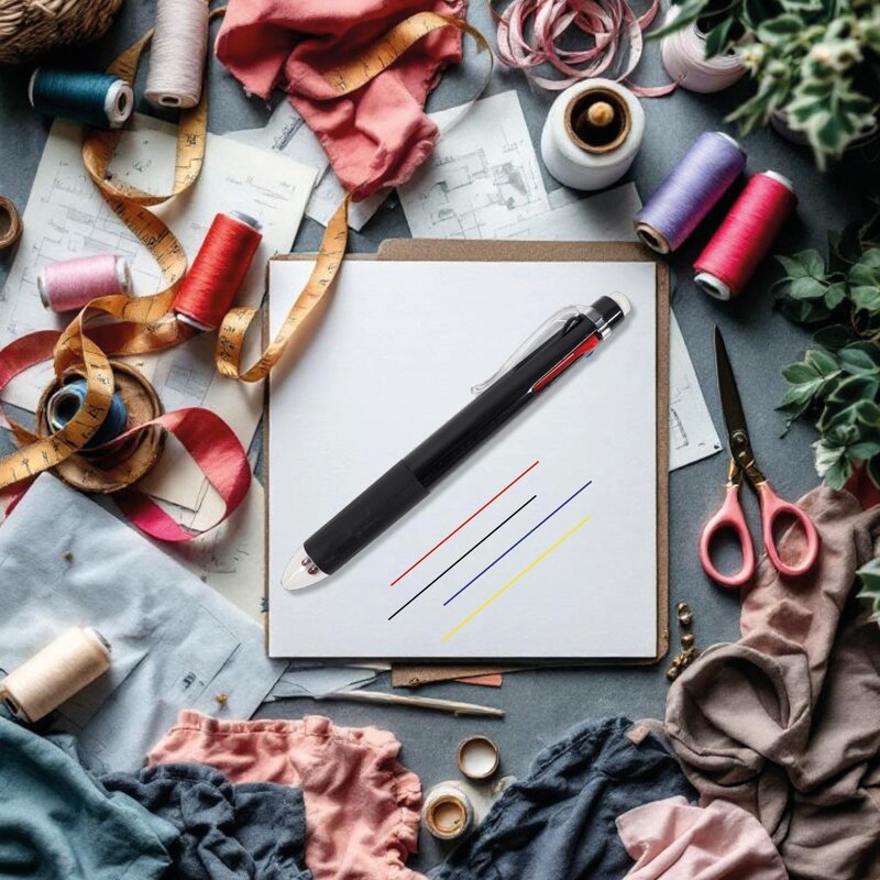 Pennan är utrustad med fyra färgade stift – blå, röd, gul och svart, vilket gör det enkelt att välja rätt färg beroende på material och tygkulör. Markeringarna avlägsnas smidigt med värme, till exempel genom att stryka lätt över markeringen eller använda en hårtork. Ingen tvätt behövs och inga rester lämnas kvar.