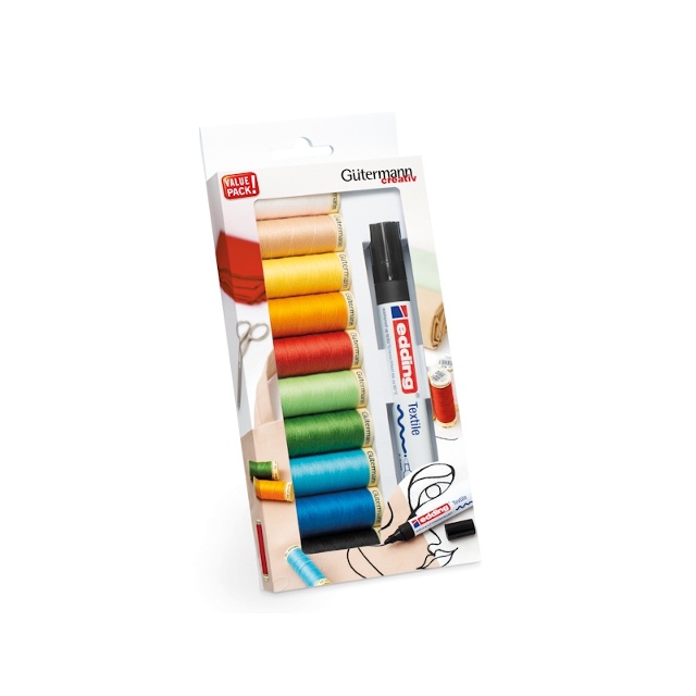 Trådset med 10 st trådrullar "Alla tygers tråd 100 m" i olika färger samt en vattenfast textilpenna. Gütermann 100 meters polyestertråd är utmärkt lämpad för både symaskin-, overlock- och handsömnad, oavsett typ av söm. Tvättbar upp till 95 grader.