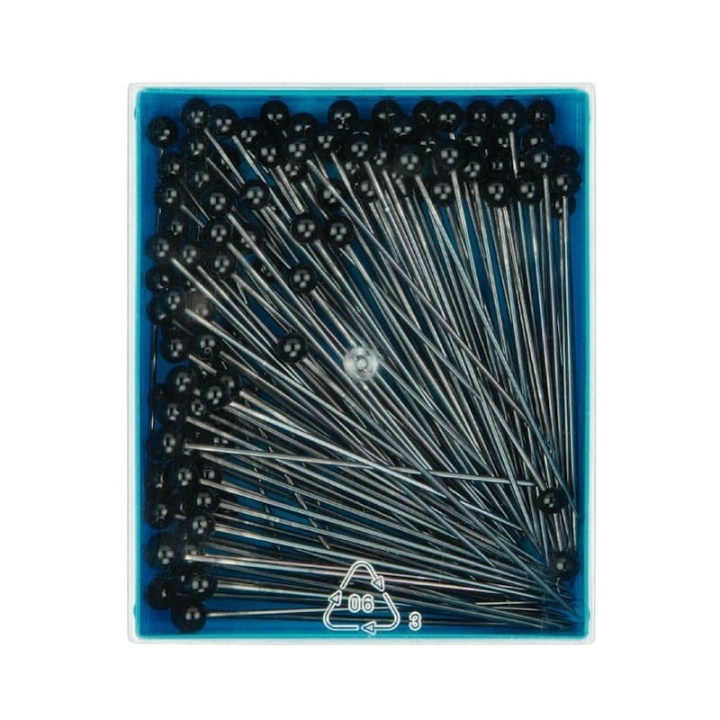 Knappnål av härdat stål med svarta glashuvuden. Knappnålar med glashuvud är premiumnålen när det kommer till knappnålar, då de tål att strykas på. Denna knappnål är extra lång och passar därför bra för exempelvis quiltning. Dess fina spets tränger lätt genom alla tyger utan att skada fibrerna.