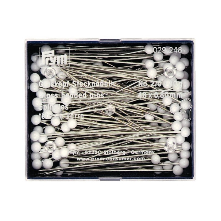 Knappnål av härdat stål med vita glashuvuden. Knappnålar med glashuvud är premiumnålen när det kommer till knappnålar,