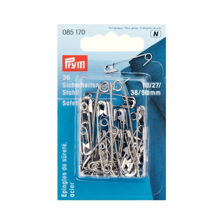 Säkerhetsnålar i stål är de mest använda fästhjälpmedlen vid sömnad, quiltning och lappteknik men används även universellt i många vardagliga situationer. De har en rostsäker beläggning och de smala spetsarna gör det lättare att sätta in dem även i tjocka, solida material och skyddar tyget. Nålarna har en hög stängningskraft även när de öppnas och stängs ofta eftersom stålet som används har en balanserad fjäderkraft. Prym erbjuder de silver- eller svartbelagda nålarna sorterade efter storlek från 19 mm till 57 mm och i olika blandade sortiment.