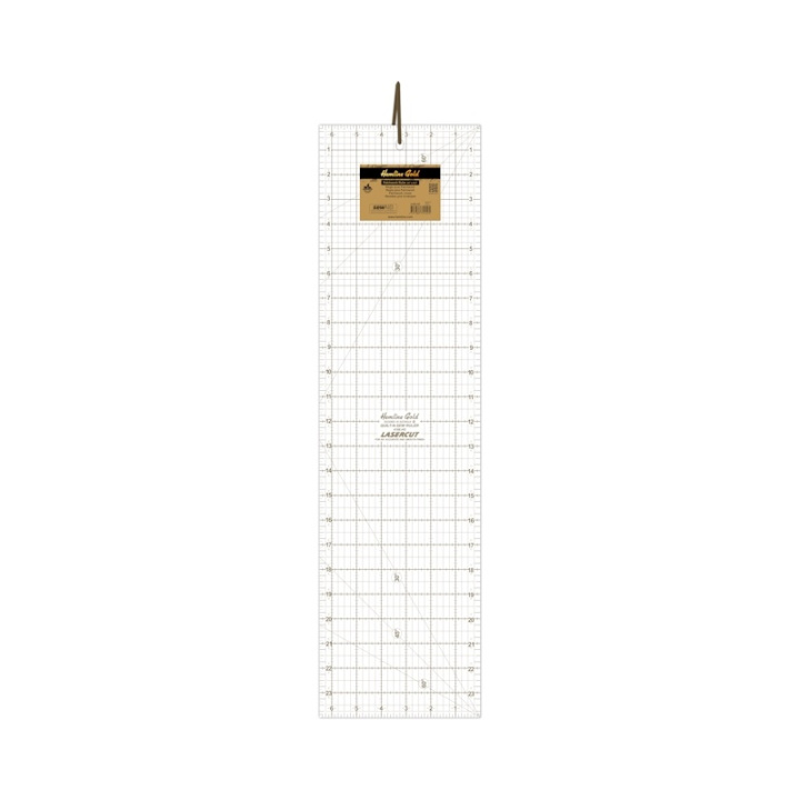 Patchwork linjal i populäraste storleken, tillverkad av tuff och slitstark akryl med lättlästa guldtryckta inch mått. Har 30, 45, 60 och 90 graders vinkellinjer. Idealisk för användning med en rullkniv och lämplig för pyssel, quiltning och patchwork.