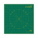 Roterande mattor är perfekta för att skära cirklar, kvadrater, trianglar, diamanter och alla former som kräver att du vänder ditt projekt eller din kropp. Den tvådelade mattan har ett halkfritt stationärt bottenskikt och en sammankopplande grön toppskärmatta med gula rutnätslinjer och markeringar som roterar 360 grader smidigt på den stationära basen. Använd helst rullknivar. Knivar med fast blad kan skada mattan.