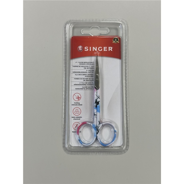 Här har vi en toppenbra bäjd broderisax från världskända Singer, med sin roliga och unika design förgyller den vilket syskrin som helst. Med det nya comfort greppet kan du klippa längre stunder utan att bli trött i handen, skären är av metall i högsta kvalité som garanterar snabba, smidiga skär. Saxens längd är 10,2cm.