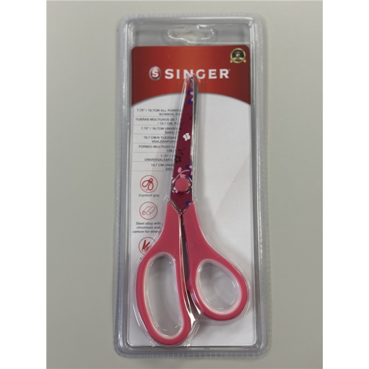 Här har vi en toppenbra sax från världskända Singer, med sin roliga och unika design förgyller den vilket syskrin som helst. Med det nya comfort greppet kan du klippa längre stunder utan att bli trött i handen, skären är av metall i högsta kvalité som garanterar snabba, smidiga skär. Saxens längd är 19,7 cm.