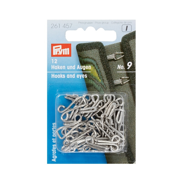 Hyskar och hakar i storlek 9 är de rätta fästena för tyngre kläder som jackor och traditionella dräkter. Till skillnad från knappar kan de silver- eller svartbelagda järnkrokarna och öglorna sys in i kläder nästan osynligt, så att tygets design inte påverkas av knäppningen.