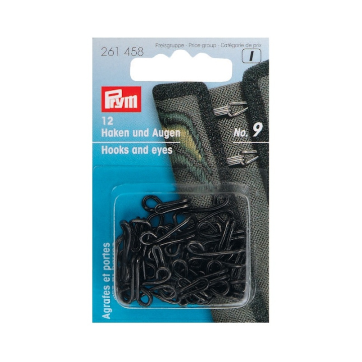 Hyskar och hakar i storlek 9 är de rätta fästena för tyngre kläder som jackor och traditionella dräkter. Till skillnad från knappar kan de silver- eller svartbelagda järnkrokarna och öglorna sys in i kläder nästan osynligt, så att tygets design inte påverkas av knäppningen.