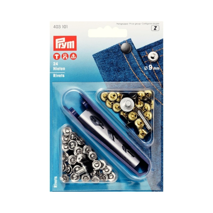 Alla känner till dem, nitarna på exempelvis jeans, som tjänar till att förstärka fickhörnen och även fungerar som ett dekorativt element. Universalnitarna från Prym med 9 mm kapsyldiameter kan användas på båda sidor, är gjorda av rostfri mässing och finns antingen i silver/gammalt järn eller i gammal koppar/polerad, beroende på din smak. Båda färgkombinationerna harmoniserar bra med klassisk denimblå. VARIO Creative Tool är också förstahandsvalet för framgångsrik fästning av nitar. Sätt bara in nitverktygssatsen (673 132) i VARIO Creative Tool och du är redo att köra. Det går även att använda Prym VARIO-tången eller stativet utan problem. En hammare och de verktyg som ingår i paketet är också lämpliga.