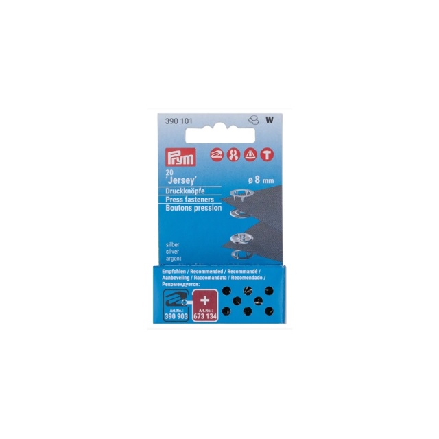 Prym Jersey tryckknappar ger lätt till medelstark stängning och är speciellt designade för tunnare och stretchiga tyger – som de som används för baby- och barnkläder. Med dessa tryckknappar behöver du inte göra ett hål innan du fäster dem. Istället trycker den integrerade självlåsande ringen in i tyget och skyddar det. Tvätta dem, torktumla dem, kemtvätt dem, stryk dem, pressa dem: Pryms rostfria jersey tryckknappar klarar uppgiften. Knappdelen finns i olika färger, storlekar och utföranden: med tandad ring, slät yta eller pärlemorimitation. Verktygen för bearbetning är också varierande. VARIO Creative Tool och den matchande Jersey-pressfästverktygssatsen (673 134) är särskilt enkla att använda för att fästa Jersey-tryckknappar med Ø 8 mm och 10 mm. Beroende på storlek finns andra tillval som VARIO-tång, stativ, hammare eller de verktyg som medföljer kombipaketen. Ikoner på förpackningen visar lämpliga verktyg.