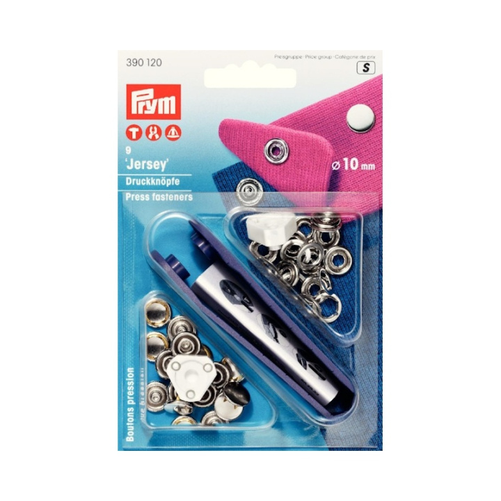 Dessa tryckknappar lämpar sig bäst för tunnare och stretchiga tyger och passar extra bra till barn och babyplagg. De nitade tryckknapparna håller ännu bättre än de klassiska påsydda tryckknapparna. Dessutom behövs inget hål göras för att fästa, eftersom den integrerade tandade ringen helt enkelt förskjuter tyget. Speciellt passande för tunnare och stretchiga tyger, kännetecknas de sömlösa tryckknapparna av en lätt till medelhög stängningskraft. Tvätt, centrifugering, rengöring och strykning är alla möjliga med de rostfria "Jersey" tryckknapparna gjorda av mässing. Tryckknapparna med en diameter på 12 mm kan monteras antingen med det medföljande verktyget, VARIO Creative Tool (390 903, 390 906, 390 907 & 390 908) med verktyg 673134, VARIO-tång (390 900, 390 901 & 390 902), stativ (673 130) och hammare (673 120)