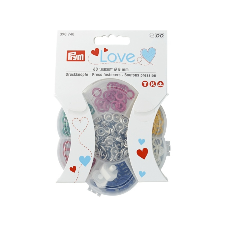 Denna praktiska, låsbara blomformade låda tillverkad av högkvalitativ plast och idealisk för förvaring, innehåller 60 non-sew "jersey" tryckknappar i 6 olika färger. Prym Love icke-sydda tryckknappar är särskilt lämpliga för tunnare, stretchiga tyger, såsom spädbarns- eller barnkläder. Tryckknapparna kan fästas med Variotången, stativverktyget eller vikverktyget - du behöver inte göra hål i tyget i förväg. Steg-för-steg-instruktioner på baksidan av förpackningen gör det enkelt att arbeta med dessa tryckknappar.