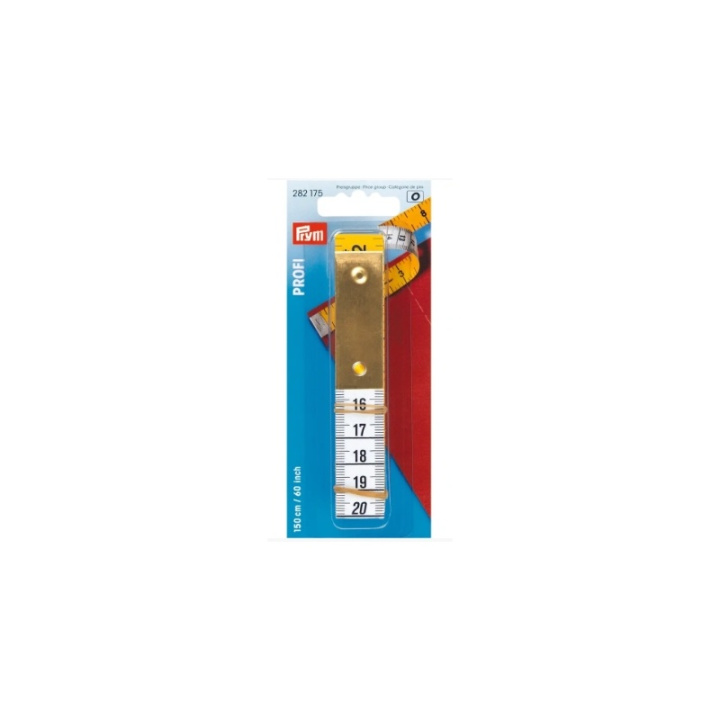 Den 10 cm långa metallplattan i början av Prym PROFI-måttbandet gör det möjligt att göra mätningar även vid intima delar av kroppen. Med en löplängd på 1,50 m skalas den vita sidan i centimeter, den gula sidan skalas i tum. Tack vare öglan i mitten av metallplattan är det möjligt att hänga måttbandet var som helst eller att använda det vertikalt i hängande läge. Med en bandtjocklek på 0,5 mm är den en långvarig hjälpreda för alla proffs och hobbyskärare.