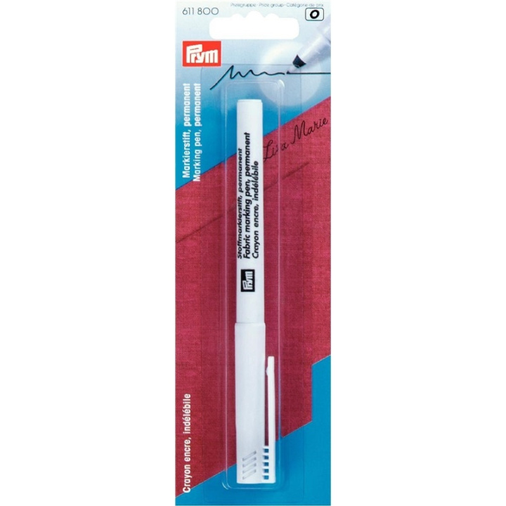 Den permanenta märkpennan från Prym är särskilt lämplig för att göra markeringar. Med den tunna spetsen kan du enkelt rita linjer på ljusare och olikfärgade tyger. Märkningspennans fina design är särskilt lämplig för mycket fina markeringar och etiketter på tyget. Att markera mönster och stenciler är också enkelt med denna vattentäta permanenta markörer.