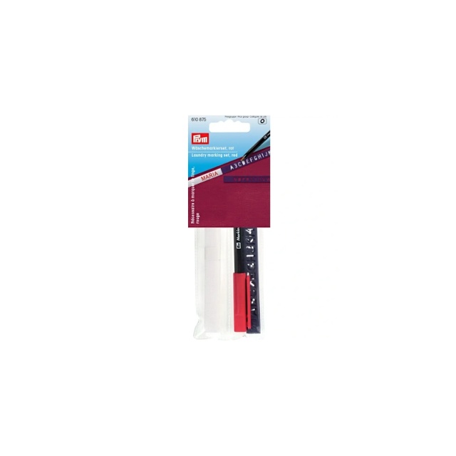 Tvättmärkningssetet från Prym innehåller 3m påstrykningstejp, en röd tvättpenna och en stencil med alla bokstäverna i alfabet. Etiketter och textilbläck kan tvättas upp till 95 grader.