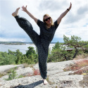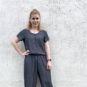 Siw Jumpsuit har en lös passform med resår i midjan. Den är sydd i tunna tyger med fint fall och är lätt och rörlig. Jumpsuiten kan sys i stretchtyger med ribbstickning i halsen, eller i enfärgade tyger med knappar framtill. Du kan välja mellan flera olika överdelar: Hög, rund hals, nedre V-ringning, singlet-version, halterneck, T-shirtärmar, medellånga ärmar, 3/4-långa ärmar eller långa ärmar. Det är också möjligt att sy byxdelen med olika längder. Mönstret har en indelning för både shorts och caprilängd.