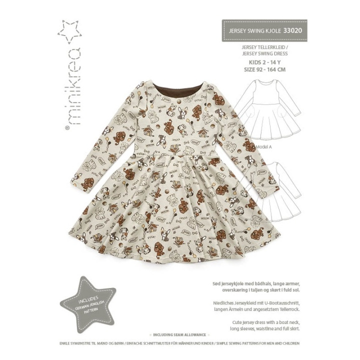 Denna söta jerseyklänning har båthals, långa ärmar, midja och hel kjol. En söt snurrklänning.