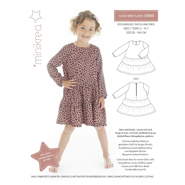 Söt enkel klänning för vävt tyg med långa ärmar, urringning, dragkedja och volangfåll. Bekväm, lös passform.