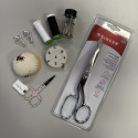 I setet ingår en tygsax för klippning av tyg, en trådsax för precision och detaljer samt ett upprullningsbart måttband som gör det enkelt att mäta vid sömnadsprojekt. Den medföljande nåldynan håller nålarna säkert på plats, medan knappnålar med huvud ger god kontroll vid nålning av tyg.