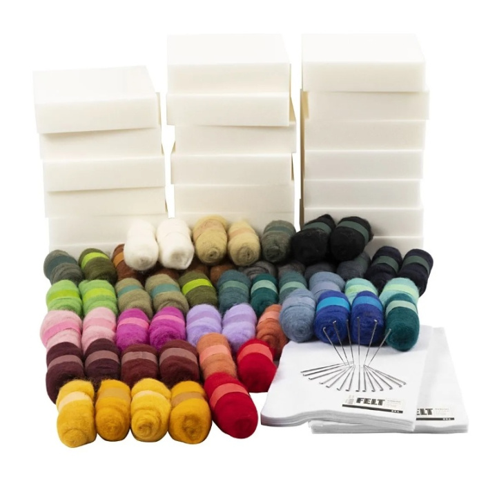 Innehåller: 20 st. nålfiltsplattor, 1300 g kardad ull, 20 ark hobbyfilt och 20 st. filtnålar .