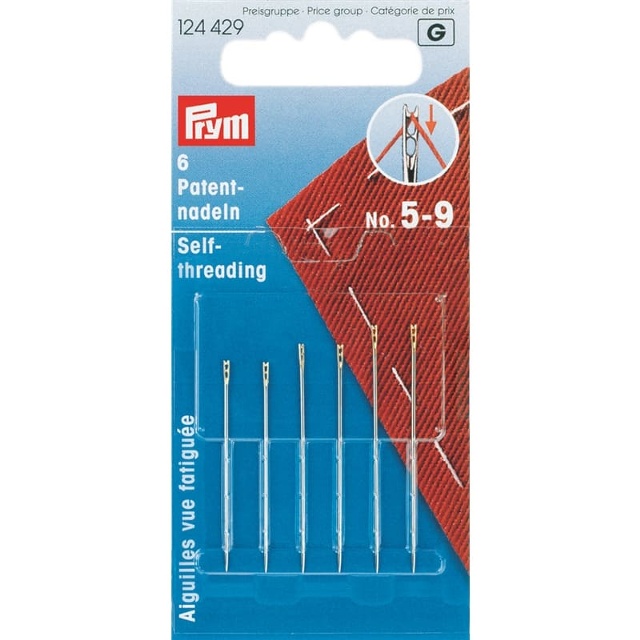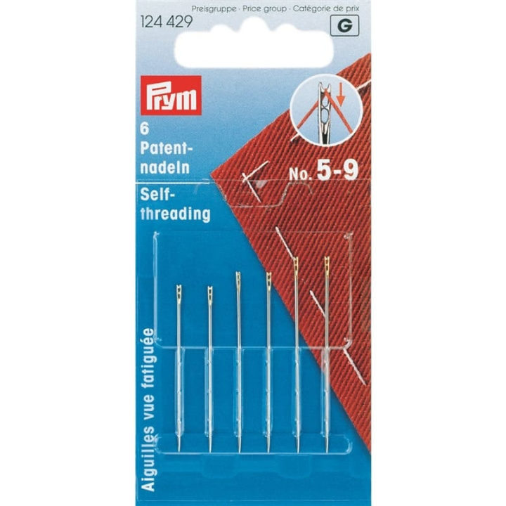 Patentnålarna, även kallade blindnålar, har ett speciellt, öppet och fjädrande öga. De är relativt lätta att trä eftersom man bara behöver dra den spända tråden genom öppningen i det övre ögat, där tråden sedan hålls på plats. Det gör att även personer med synnedsättning inte har några problem med att trä. Förutom detta speciella, gradfria öga har denna nål även de välkända kvalitetsparametrarna för en klassisk synål, såsom den enhetliga, porfria ytan för glidförmåga, den koordinerade fjäderhårdheten och den långa och särskilt slanka spetsform. Prym erbjuder patentnålarna i förpackningar om 6 i storlekar nr 5 till 9.