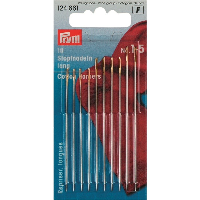 Prym erbjuder stoppnålar av härdat stål i olika längder. Korta nålar för stoppning av ullplagg och strumpor, samt långa nålar för finare stoppningsuppgifter. Nålarna har den typiska avsmalnande formen som en handsynål, men är mycket större i storlek och har därför ett proportionellt anpassat större öga. Detta möjliggör också trädning av kraftigare garn och ull. Ytan på stoppnålarna är gradfri och rostbeständig. Det ser till att nålen lätt kan glida genom materialet.