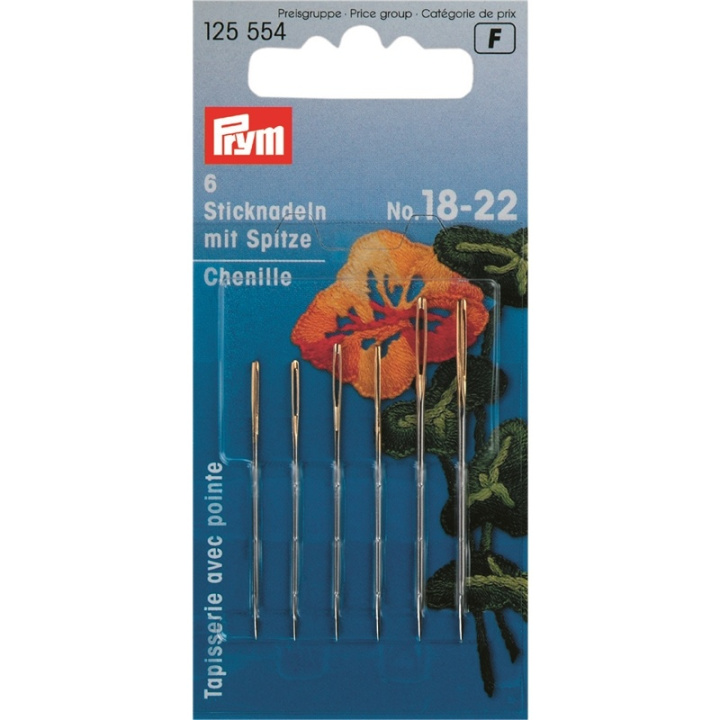 Chenille broderinålar med vass spets lämpar sig främst för sidenbroderi och andra fina broderier. Nålarna är gjorda av absolut gradfritt härdat stål och har ett symmetriskt stansat öga. För enkel trädning av ull eller tjockare garn behöver broderinålar ett motsvarande stort öga. Den finslipade spetsen och den släta belagda ytan på nålarna gör att de utan ansträngning kan glida genom alla material. Ett balanserat förhållande mellan längd och styrka ger nålarna sin goda användningsflexibilitet. I Prym-sortimentet ingår broderinålar i ett kort med 6 enheter i storlekar nr. 16 till 24 och som en assorterad förpackning i storlekar nr. 18 till 22.