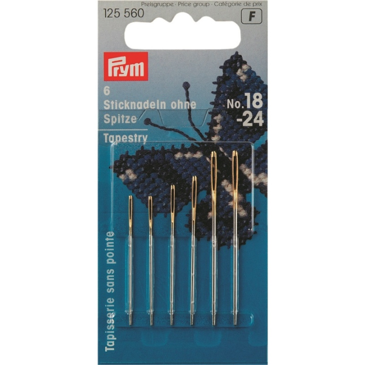 Eftersom den rundade spetsen inte penetrerar fibrerna utan snarare skjuter dem åt sidan är broderinålarna särskilt lämpliga för broderi med grövre material som exempelvis ull. Nålarna med det symmetriskt stansade ögat är gjorda av absolut gradfritt härdat stål. För trädning av tjockare garn eller ull måste ögat i broderinålar vara motsvarande storlek. Det balanserade förhållandet mellan längd och styrka ger nålarna sin goda användningsflexibilitet. Prym-sortimentet erbjuder gobelängbroderinålar med trubbig spets på ett kort med 6 enheter i storlekar nr. 14 till 26 och i tre olika sortiment.