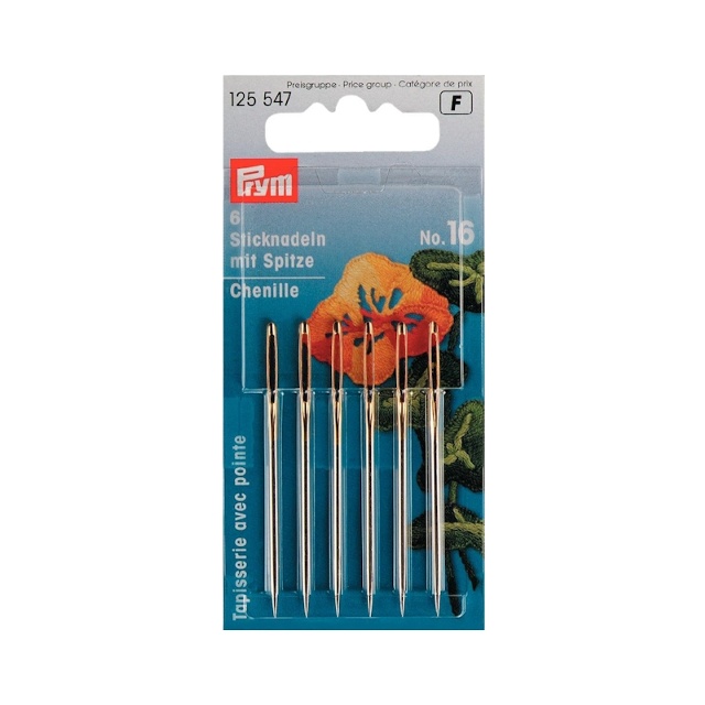 Chenille broderinålar med vass spets lämpar sig främst för sidenbroderi och andra fina broderier. Nålarna är gjorda av absolut gradfritt härdat stål och har ett symmetriskt stansat öga. För enkel trädning av ull eller tjockare garn behöver broderinålar ett motsvarande stort öga. Den finslipade spetsen och den släta belagda ytan på nålarna gör att de utan ansträngning kan glida genom alla material. Ett balanserat förhållande mellan längd och styrka ger nålarna sin goda användningsflexibilitet. I Prym-sortimentet ingår broderinålar i ett kort med 6 enheter i storlekar nr. 16 till 24 och som en assorterad förpackning i storlekar nr. 18 till 22.