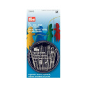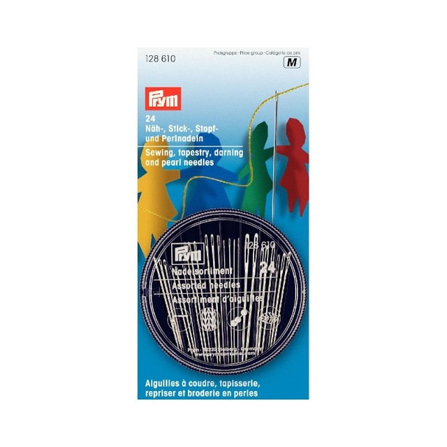 Den praktiska förvaringsasken av lila plast med transparent, tryckt lock innehåller 24 sy-, broderi-, pärl- och stoppnålar i olika storlekar med silverögon. Alla krav för mindre sömnads-, broderi- och stoppningsarbeten, men även hantverks- och applikationsarbeten, omfattas av denna uppsättning. De erforderliga nålarna kan tas bort från burkens respektive fack genom en sidoöppning i det roterande locket. De kan sedan återföras till burken och förvaras där.