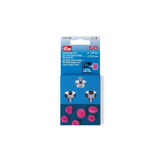 Om Color Snaps-tryckknappen inte är placerad på rätt ställe eller en annan färg skulle vara snyggare efteråt är demonteringssetet Color Snaps ett praktiskt verktyg. Metall- och hårdgummiverktygen är perfekta för att ta bort båda tryckknappsdelarna - både Color Snaps med Ø 12,4 mm och Color Snaps Mini med Ø 9 mm. Detta gör det enkelt att lägga till ett rosa hjärta istället för en blå stjärna. Den fuchsiafärgade kodningen gör det lättare att tilldela den till andra Color Snaps-verktygsuppsättningar och förbrukningsmaterial. Detaljerade instruktioner förklarar applikationen. Det är viktigt att varje gång plastknappen lossas avlägsna plastrester i metalldelen. Prym sylen (610 935) är särskilt lämplig för detta.