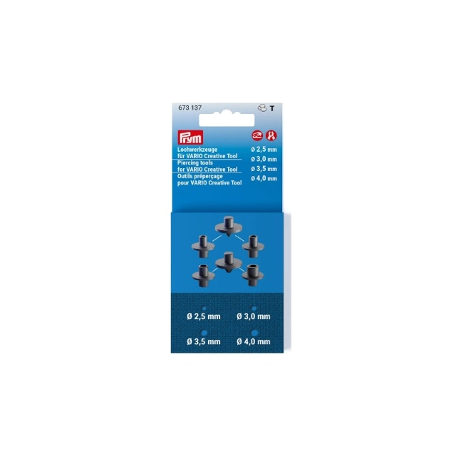 För att öljetter, nitar, tryckknappar eller andra icke-sydda föremål ska försköna tyget, måste ett hål vanligtvis slås först. Detta kan göras enkelt och exakt med stansverktygen från Prym och VARIO Creative Tool (390 903, 390 906, 390 907 & 390 908). Som ett alternativ kan även Prym VARIO-tången (390 900, 390 901 & 390 902) användas. Stansverktyg i storlekarna 2,5, 3,0, 3,5 och 4,0 mm ingår redan i originalförpackningen till VARIO Creative Tool. Om de tappas bort kan verktygssatsen i dessa storlekar användas som ersättning. 6-hålsverktyg är redo för omedelbar användning. Den andra verktygssatsen täcker större diametrar med 5 verktyg: hål med diametrar på 4,5, 5,0 och 6,0 mm stansas enkelt. Ett idealiskt tillskott, speciellt för alla som gillar att använda stora öljetter eller använda hål som dekorativa element.