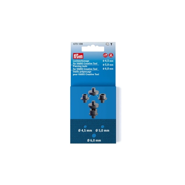 För att öljetter, nitar, tryckknappar eller andra icke-sydda föremål ska försköna tyget, måste ett hål vanligtvis slås först. Detta kan göras enkelt och exakt med stansverktygen från Prym och VARIO Creative Tool (390 903, 390 906, 390 907 & 390 908). Som ett alternativ kan även Prym VARIO-tången (390 900, 390 901 & 390 902) användas. Stansverktyg i storlekarna 2,5, 3,0, 3,5 och 4,0 mm ingår redan i originalförpackningen till VARIO Creative Tool. Om de tappas bort kan verktygssatsen i dessa storlekar användas som ersättning. 6-hålsverktyg är redo för omedelbar användning. Den andra verktygssatsen täcker större diametrar med 5 verktyg: hål med diametrar på 4,5, 5,0 och 6,0 mm stansas enkelt. Ett idealiskt tillskott, speciellt för alla som gillar att använda stora öljetter eller använda hål som dekorativa element.