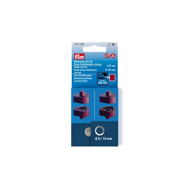 Närhelst lätt till medelstor knäppkraft krävs är Prym jerseytryckknappar särskilt lämpliga. De stänger tillförlitligt kläder gjorda av tunnare och stretchiga tyger och är lätta att öppna och stänga. Jerseyknappar är oumbärliga tillbehör, speciellt för babybody och skjortor för småbarn. Med verktygssatsen för jerseyryckknapparna kan du säkert fästa tryckknappar med en diameter på 8 och 10 mm. Beroende på storlek sätter du bara in två av de fyra verktygen i Vario Creative Tool, placerar tyget och sänker kraftspaken. Tryckknappen sitter redan stadigt i tyget; Verktygssatsen för tryckknappar i jersey är också kompatibel med Prym Vario-tången (390 900) och Prym-stativet (673 130). Knapparna i jersey och alla tillhörande verktygssatser har en vinröd märkning på förpackningen och på verktygen - så att du vid första anblicken kan se vad som hör ihop. Förpackningen fungerar också som förvaring av alla verktyg för VARIO Creative Tool finns snabbt till hands i de färgkodade lådorna.
