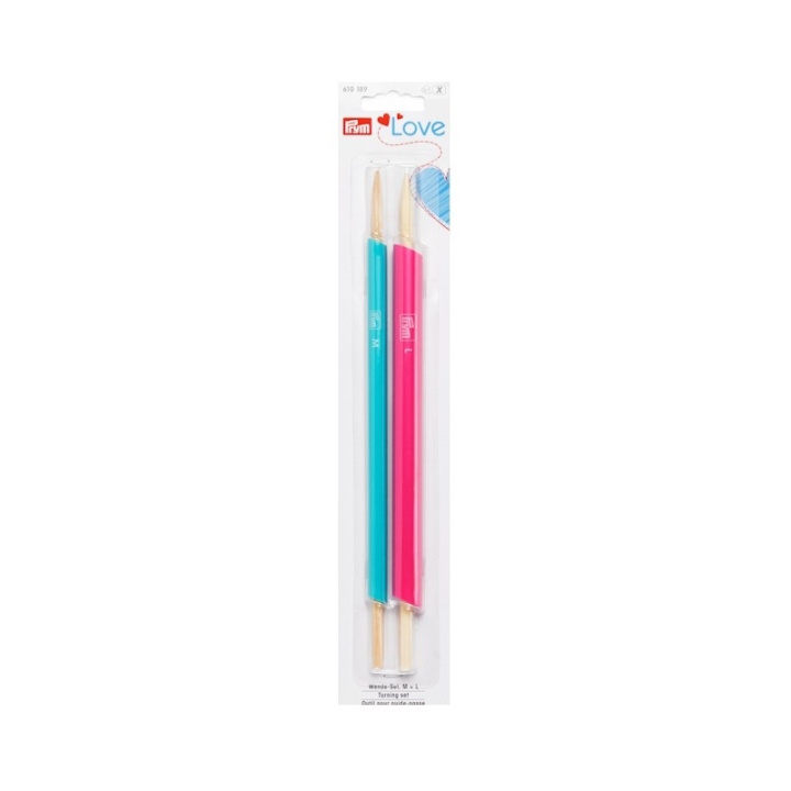 Oavsett om det gäller axelband eller bältesöglor, detta praktiska vändset från Prym Love-serien gör det mycket lättare att vända tygband till rätsidan och är därför ett särskilt användbart sytillbehör. Beroende på storleken på vändsetet du väljer, kan du utan ansträngning vända rätsidan ut vilken storlek som helst av självtillverkat tygband från smala bältesöglor till väskhandtag. Tygbandet sys först och främst på ena sidan och dras sedan över plaströret. Du kan sedan använda bambustaven för att trycka tyget genom röret och vända det med rätsidan utåt. Svarvsatsen finns i två storlekar: för tunnelstorlekar på 19 mm till 25 mm i mint (storlek M) och för tunnelbredder över 25 mm i rosa (storlek L).