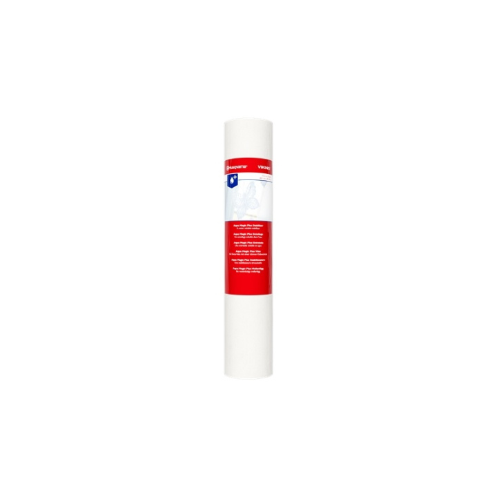 Husqvarna® Viking® Aqua Magic Plus är en vattenlöslig stabilisator med tillsats av ett vattenlösligt lim. Husqvarna® Viking® Aqua Magic Plus är ett tygliknande mellanlägg med ett tunt lager lim som gör att du kan "klistra" ditt tyg på mellanlägget i bågen. Den är bra för små föremål eller tyger som inte bör spännas. Eftersom Husqvarna® Viking® Aqua Magic Plus stabilisator sköljs bort helt, kommer den att lämna ditt projekt mjukt och böjligt, inte styvt. Detta är ett måste för de vackra, dekorativa sydda halsdukarna i garn. Limmet håller band, garn, tyger och alla andra kreativa material du vill ha på plats. Den kan ersätta applikationer som kräver stabilisator av klibbig typ, såsom små föremål som inte passar i en båge eller broderier utan "båge" med den extra fördelen att allt mellanlägg löses upp. Perfekt för lätta till medelviktiga vävda, lätta till medelviktiga stickningar – inklusive "slinky" stickning, batiste, organza, organdy, chiffong, tyll, nät, handdukar/frotté, minkee och polar fleece.