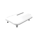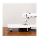 Förlängningsbordet monteras på symaskinens friarm och skapar en plan arbetsyta i nivå med maskinens syyta. Den större ytan gör det enklare att hantera större tygstycken och ger bättre kontroll över tyget under sömnaden.