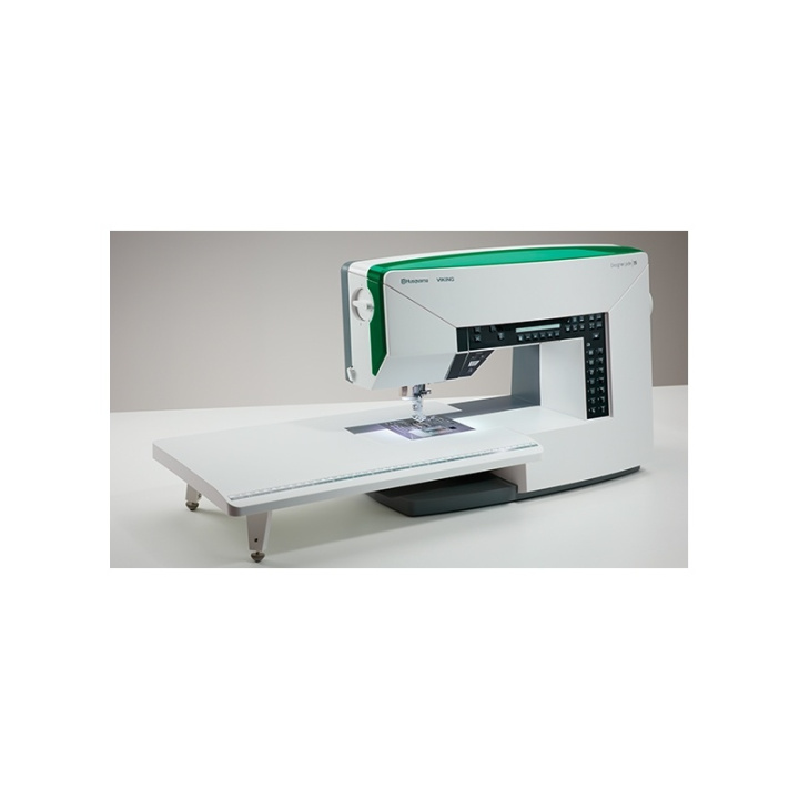 Förlängningsbordet monteras på symaskinens friarm och skapar en plan arbetsyta i nivå med maskinens syyta. Den större ytan ger bättre kontroll över tyget under sömnaden och gör det enklare att arbeta med större tygstycken.
