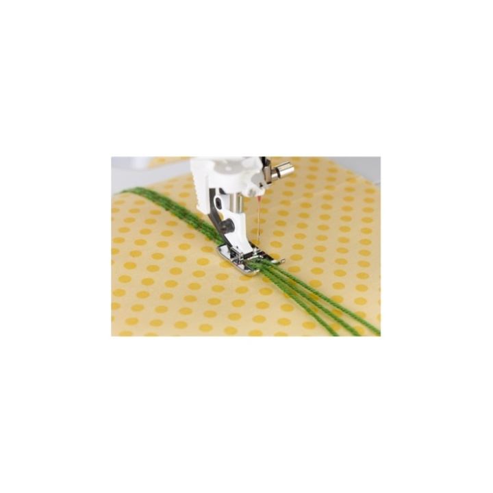 Dekorera ditt sömnadsprojekt med olika sorters dekorsnoddar eller garn med hjälp av de vackra breda HUSQVARNA® VIKING®-sömmarna och garnfot med tre hål. Foten leder lätt garnet genom öppningarna på framsidan och bakåt genom spåret under pressarfoten. Man syr över dekorgarnet som bildar en vacker flätad utsmyckning.