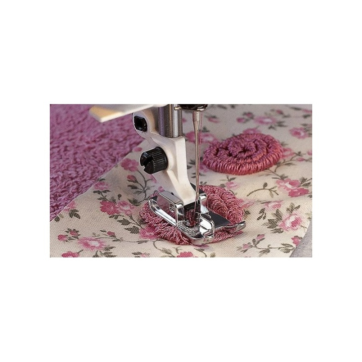 Överför mönstermarkeringar till tyget med trådöglor. Används också i dekorativt syfte vid sömmar, eller till frans eller en lejonman. Använd sicksack, stygnlängd 1,5–2,5, bredd 3. Snäpp fast markeringsfoten. Minska lite på trådspänningen..