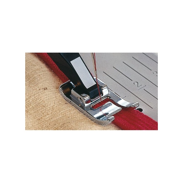 3. Lägg tyget och snodden under passpoalfoten och se till att snoddens runda del kommer i spåret på fotens undersida.