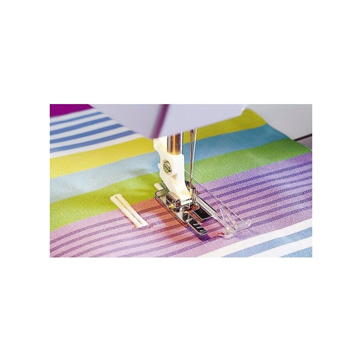Knapphålsfoten har en skjutlinjal som kan ställas in för olika knappstorlekar, så att flera knapphål kan sys med samma storlek.
