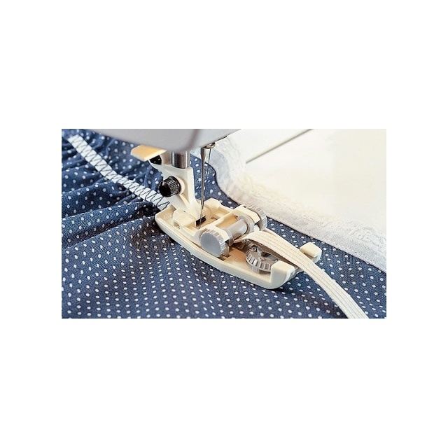Resårfoten styr och sträcker ut 6 till 12 mm breda resårband och syr fast dem samtidigt. Använd foten när du syr träningsplagg, underkläder och andra arbeten där man brukar trä resårer i kanaler.