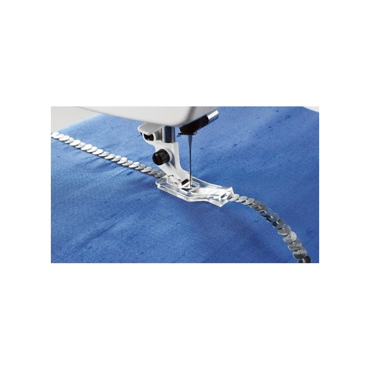 Dekorera dina sömnadsprojekt med glittrande paljetter med hjälp av paljettbandsfoten. Pressarfoten leder enkelt paljettbandet genom ett spår på pressarfotens framsida, samtidigt som symaskinen osynligt syr fast dem. Endast runda paljetter kan användas.