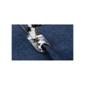 5. Använd ledarna på framsidan av fällsömsfoten för att vika den bredare sömsmånen över den smalare sömsmånen. Sy fast med en raksöm.