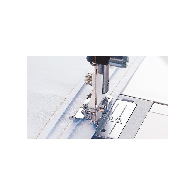 Kantstickningsfoten hjälper till att styra sömmen vid kanten. Denna pressarfot används också vid quiltning för att styra sömmen rätt när blocken sys ihop.